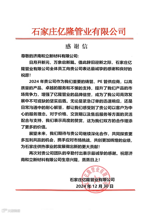 近日,济南和立新材料有限公司收到了石家庄亿隆管业有限公司的感谢信,这封感谢信彰显了和立公司在行业内的卓越口碑与优质服务能力。