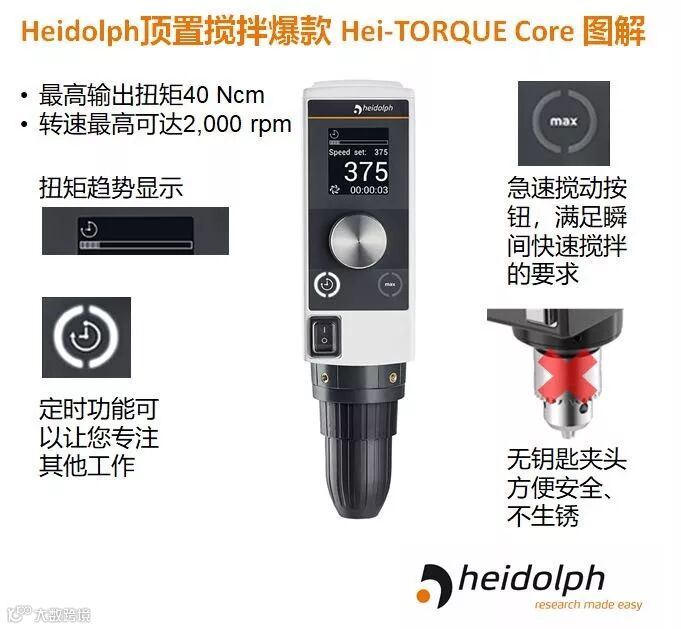 Hei-TORGUE Core适用于低粘度到中等粘度的搅拌,最大搅拌量25L,允许使用大直径(10mm)搅拌桨,应用更加广泛。