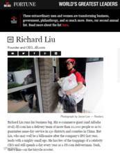 “刘强东所创立的京东集团发展迅速,他打造了由数万人组成的配送力量,确保订单在中国超过130个区县实现当日送达。虽然公司上市后刘强东已经成为亿万富翁,但他依然充满亲和力并很‘接地气’,没有明星CEO的架子,每年抽出一天时间亲自为客户送货。”[48]