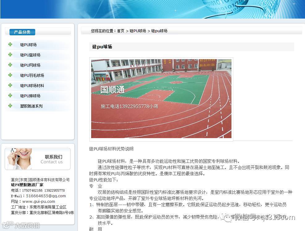 重庆[东莞]国顺通体育科技有限公司主要从事硅PU球场材料,丙烯酸篮球场,塑胶篮球场,塑胶球场,塑胶跑道,硅PU羽毛球场等各类地坪的设计与施工。