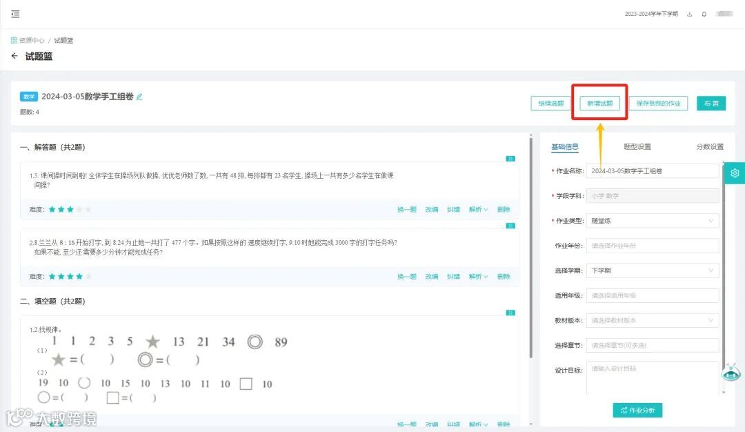 进入试题篮后,点击【新增试题】