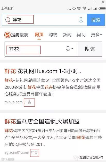 搜索并列出现,然后标题关键词会被标红,下方会有广告标识。