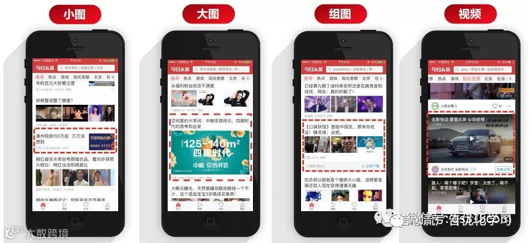 头条信息流广告的创意素材形式,有小图、大图、组图和视频。