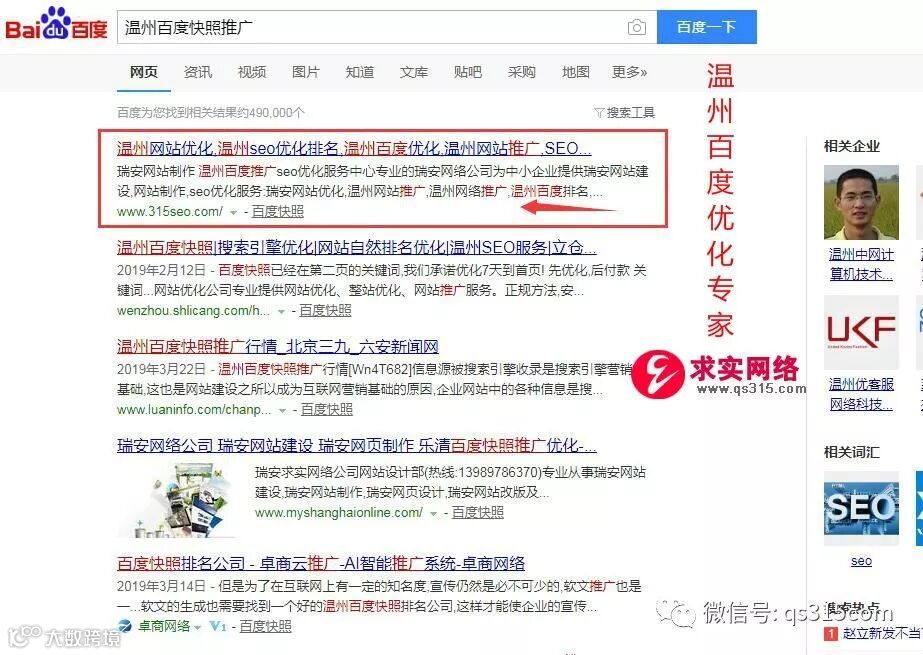 在百度上搜索“温州百度优化”,“温州百度快照优化”均可在前二名找到求实网络公司的推广网站。