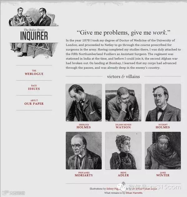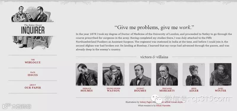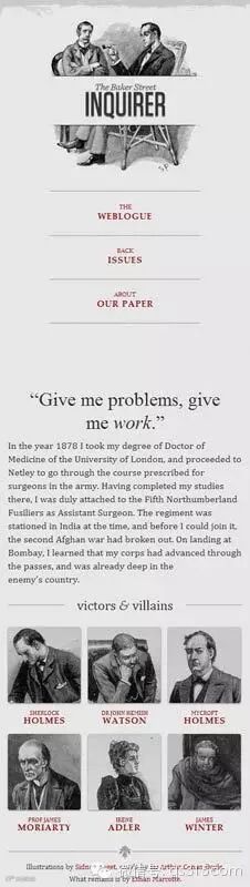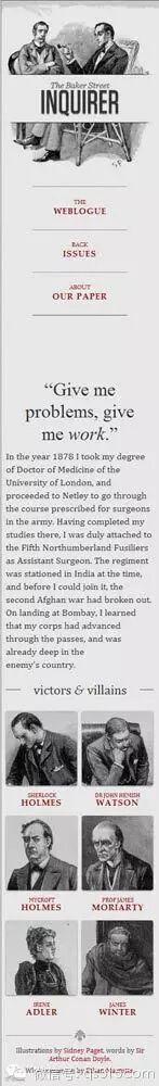 他制作了一个范例,里面是《福尔摩斯历险记》六个主人公的头像。如果屏幕宽度大于1300像素,则6张图片并排在一行。