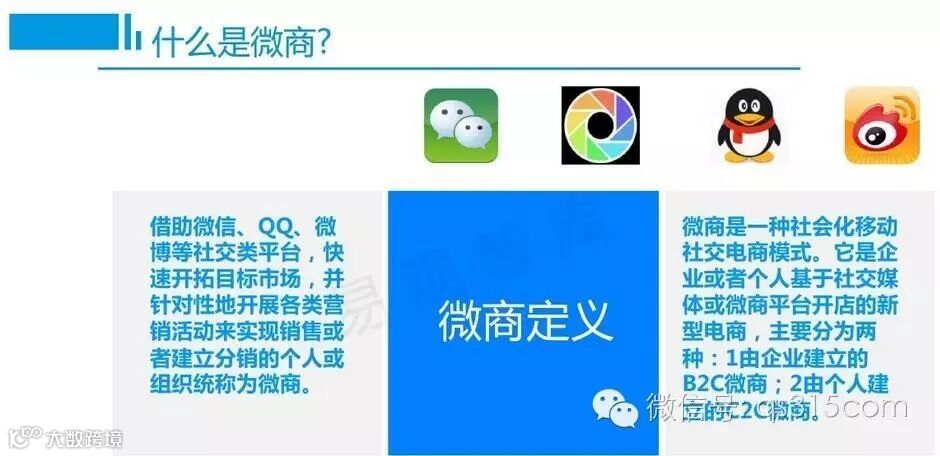 当然我们说的微商,一定是基于移动互联网的,更精准一点来说基于移动互联网上的社交工具。简单一点说,就是在手机移动互联网上能够产生社交关系的一类工具,比如微信、陌陌、微博、QQ空间等。