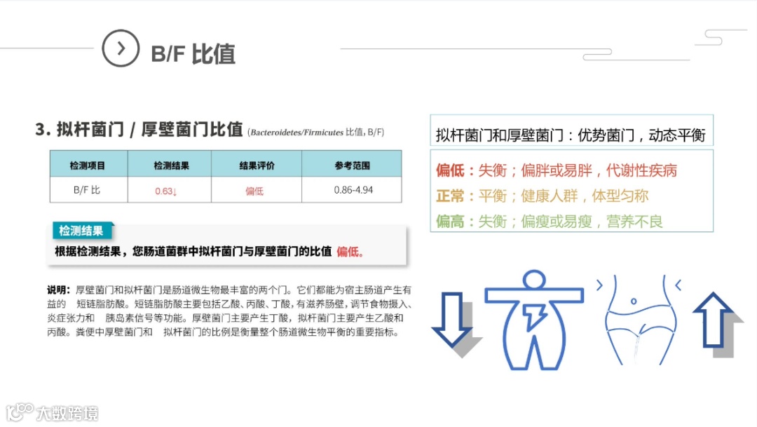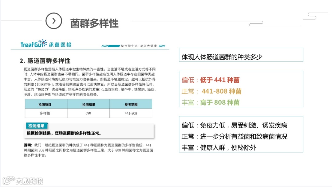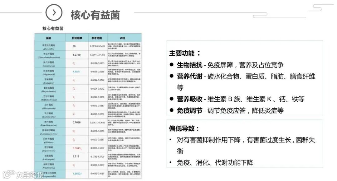 微生物菌群作为人体的“第二基因组”,跟人体的免疫、消化、代谢、内分泌、神经等各系统生理功能密切相关,菌群检测的各项数据能全面反映出菌群的平衡/失衡状况。