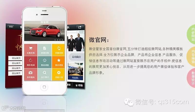 将企业微网站植入微信公众平台,关注公众平台即可访问网站。所有微网站中显示的所有文章及板块,都可以通过设置关键词,而实现自动回复。公众平台搭配"微网站",犹如虎添翼!在保留公众平台所有优势的前提下,提升展示形象,更好的与客户互动。所以在移动客户端浏览市场对浏览体验与交互性能要求的新一代网站情况下,以微网站开发技术来展示警务信息的这种方式更加的灵活化也更易接受。