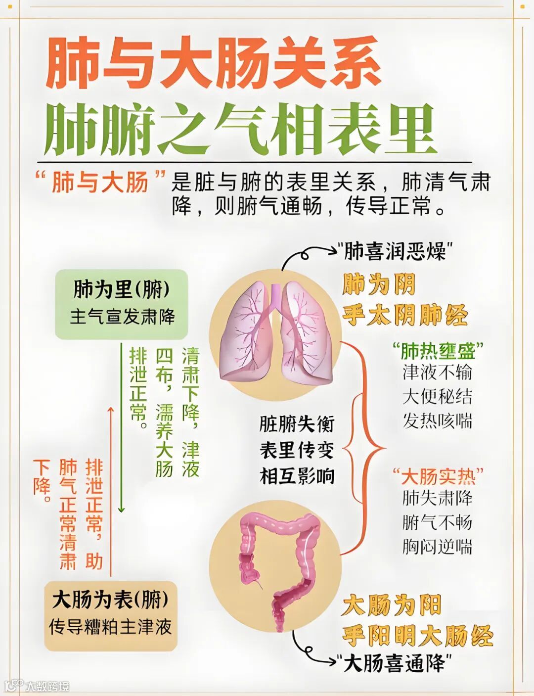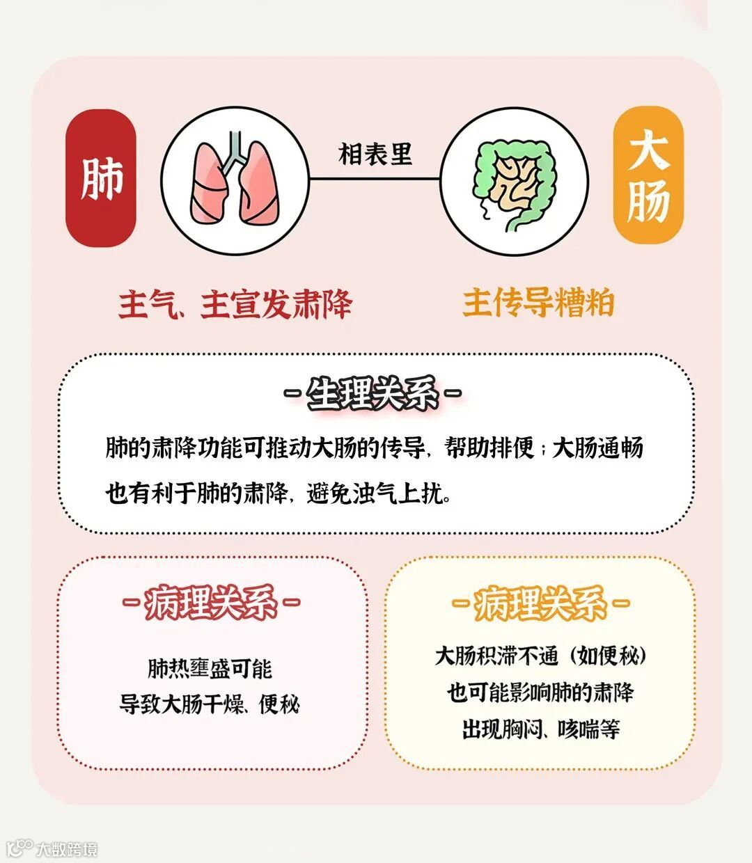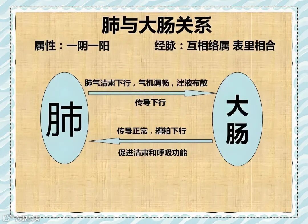 2、气机协同:肺主宣发肃降,推动气的运行。肺气降,则有助于大肠的传导功能,使粪便顺利排出。反之,大肠传导通畅,腑气通顺,也有利于肺气的肃降。