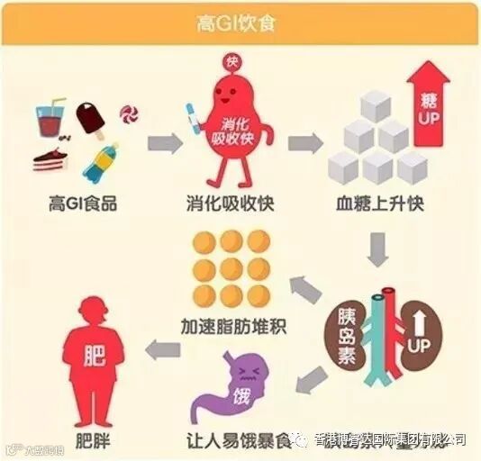 高GI值食物,在体内的消化吸收快,吃下去后血糖会在短时间内升高。之后胰岛素唤起身体机能,将吃进体内的热量转化为脂肪。同时,大量胰岛素使血糖快速下降,造成饥饿感,让我们不知不觉吃掉更多东西。