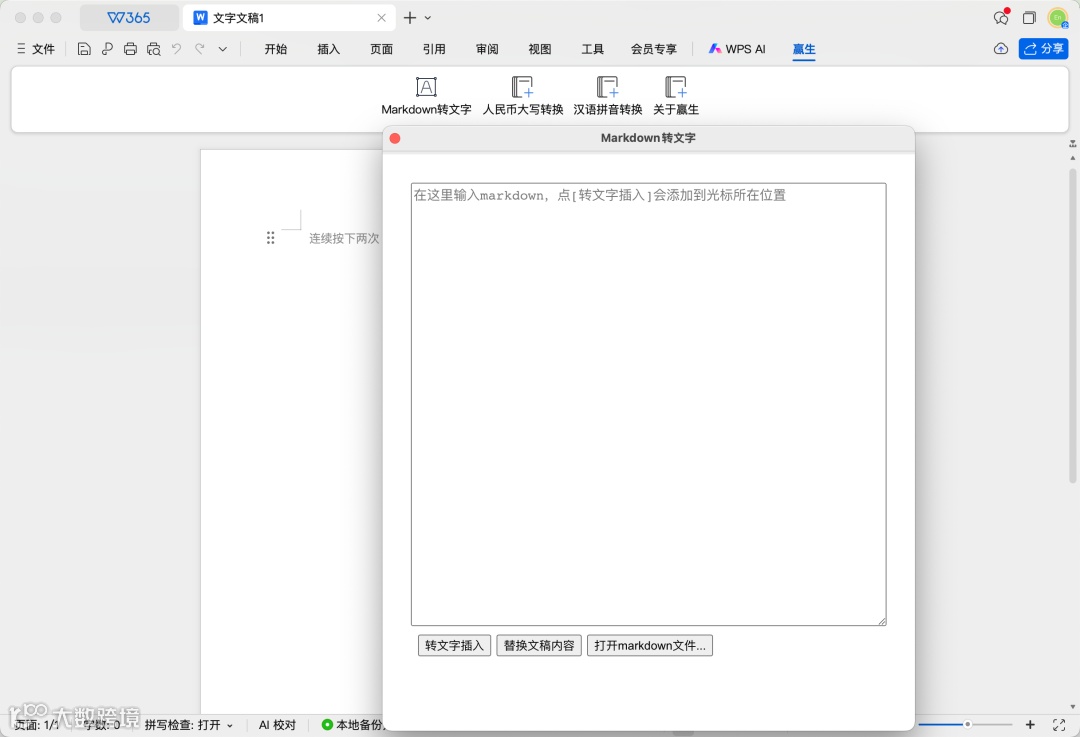 #!/bin/bashpluginDir=~/Library/Containers/com.kingsoft.wpsoffice.mac/Data/.kingsoft/wps/jsaddons/pluginUrl="https://16win.cn/wps/markdown2text/markdown2doc_1.0.0.zip"pluginFolder="markdown2doc_1.0.0"zipFile="plugin.zip"echo "下载插件压缩包..."curl -o $pluginDir/$zipFile $pluginUrlecho "解压插件..."unzip -q $pluginDir/$zipFile -d $pluginDirrm $pluginDir/$zipFilejspluginsFile="$pluginDir/jsplugins.xml"pluginContent='<?xml version="1.0" encoding="UTF-8" standalone="yes"?><jsplugins> <jsplugin name="markdown2doc" type="wps" url="https://16win.cn/wps/markdown2text/dist/" version="1.0.0" /></jsplugins>'if [ -f "$jspluginsFile" ]; then echo "修改现有的 jsplugins.xml 文件..." sed -i "" '/<\/jsplugins>/i\ <jsplugin name="markdown2doc" type="wps" url="https://16win.cn/wps/markdown2text/dist/" version="1.0.0" /> ' $jspluginsFileelse echo "创建新的 jsplugins.xml 文件..." echo "$pluginContent" > $jspluginsFilefiecho "重启 WPS..."killall wps wpsoffice wpscloudsvr wpsclouds 2>/dev/nullsleep 5open -a "wpsoffice"echo "插件安装完成!"