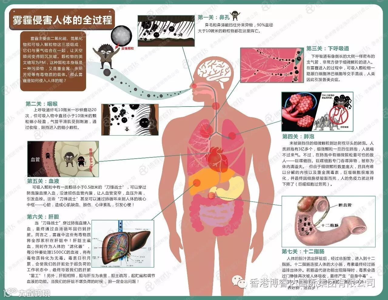 1、PM2.5颗粒首先通过鼻腔—鼻绒毛挡住大分子的粉尘颗粒;