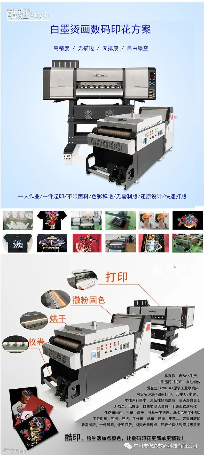 广州酷印数码设备有限公司是由广州傲彩和汕头泰和针织厂共同出资成立,我们既有20几年的爱普生、武腾等品牌大幅面打印机的维修和改造、生产机器设备的技术,又有30年印花经验,对印花工艺和流程更熟悉,我们不只考虑机器的性能和质量,也要考虑印花工艺和生产大货的需要,在保证机器质量的同时,细节的设计上更人性化,提高工厂的生产效率和出产的质量,为客户的投资提供更多的保障。