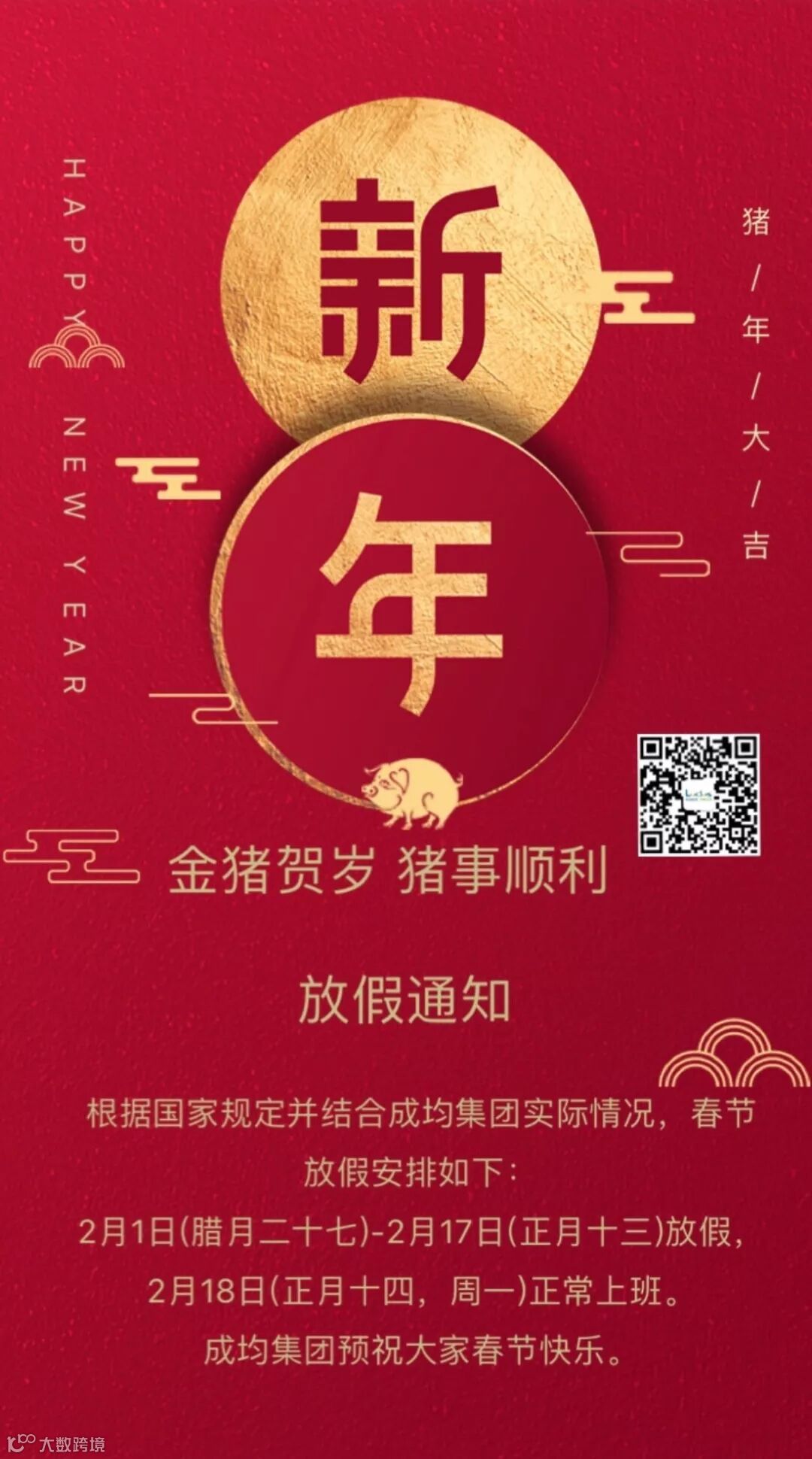 值此新春佳节来临之际,成均集团祝所有员工、合作伙伴、用户单位以及所有的朋友们,2019年新春快乐,阖家欢乐、心想事成,“猪”事皆顺。