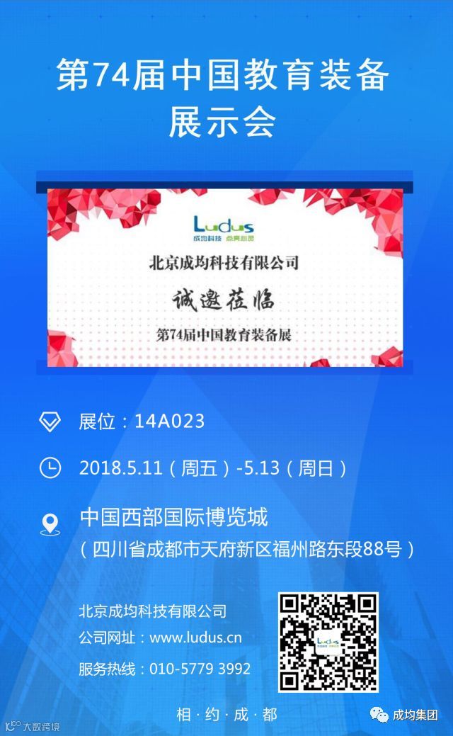 “第74届中国教育装备展示会”将于2018年5月11日-13日,在四川成都隆重举行。作为国内先进心理教育装备提供商,北京成均科技有限公司将特装亮相本次展会(展位:14A023),也将携学校心理辅导室个性化解决方案配套的软、硬件设备,心理健康教育教材、积极心理学应用书系等产品参展。5.11-5.13日在成都期待您的莅临指导!