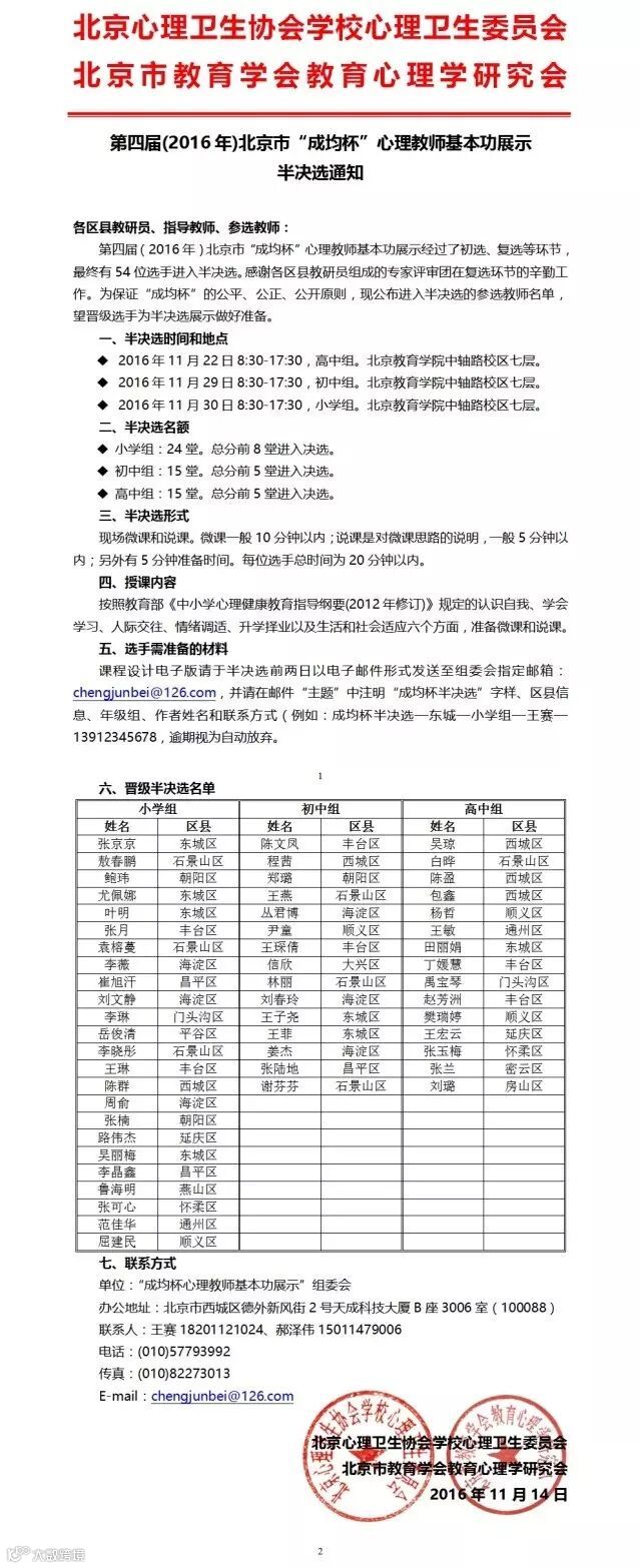 第四届(2016年)北京市“成均杯”心理教师基本功展示 半决选通知