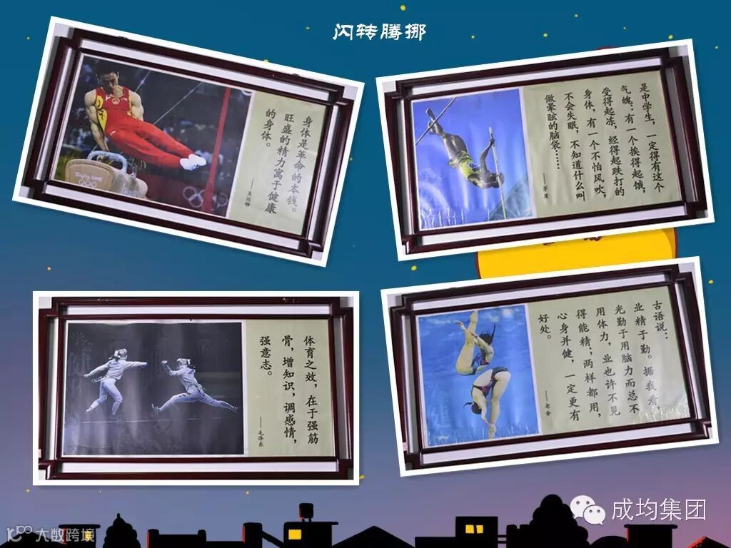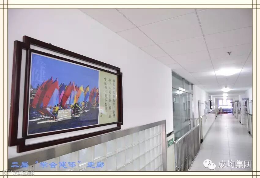 二层学会健体廊 ,借以“闪转腾挪”强体魄,其所选图画及名人名言寓意“学会健体”与“勇敢 、坚持、 团队精神、公平、 乐观希望、热情活力“的积极心理品质吻合。长廊共有装饰挂画32幅。