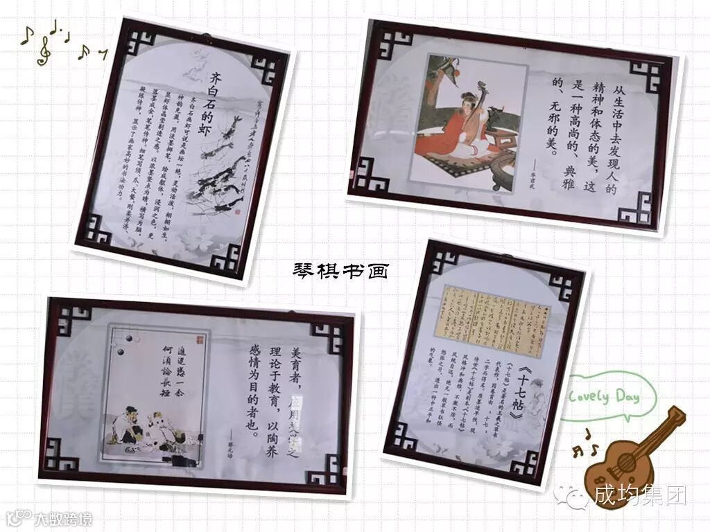 四层学会审美廊,借以“ 琴棋书画”涤心灵 ,其所选图画及名人名言寓意“学会审美”与“审美、好奇心”的积极心理品质吻合。长廊共有装饰挂画29幅。