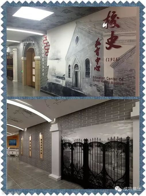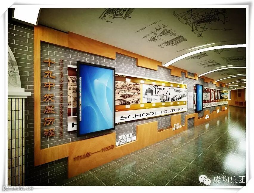 校史馆形象墙用鲜红的中英文书写“校史教育中心”及“1916”几个大字,提示从初创到现在辉煌的历史,引起悬念,启人思考。走廊以一百年的“编年体”手法来“横向”诉说十九中的故事。它以“时间”为“经”,穿越百年,抚今追昔,追溯学校发展轨迹,以传承“培元”精神。