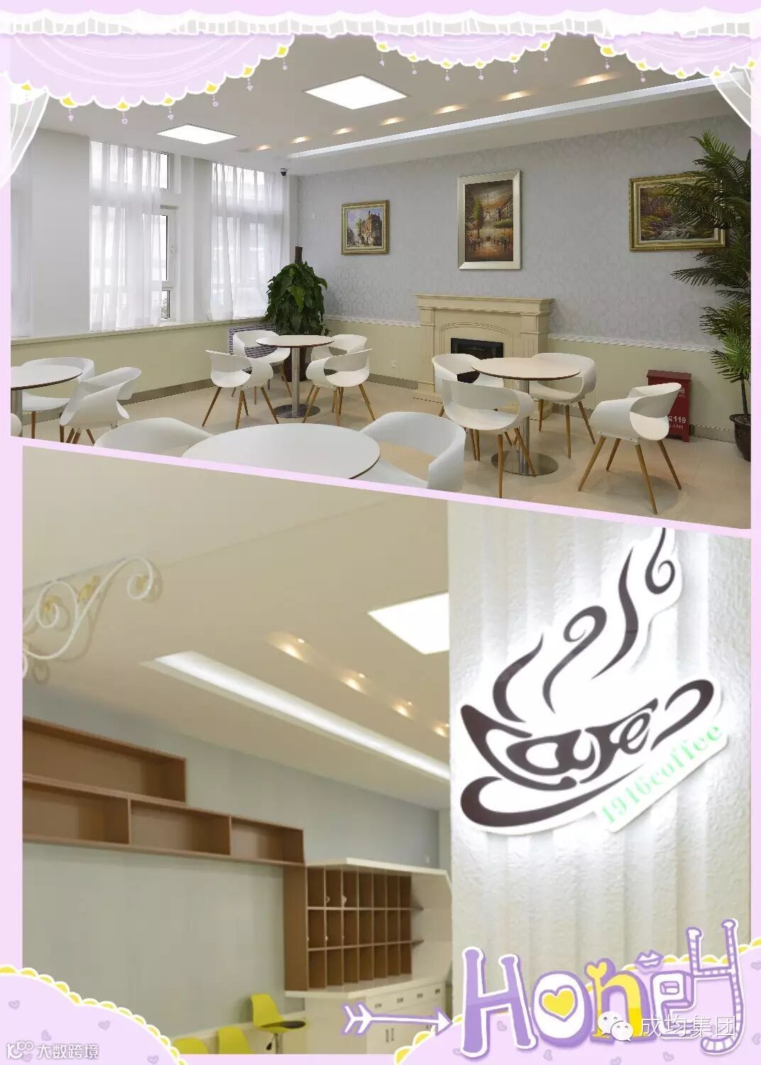 咖啡吧以“咖啡”文化为装饰主线,LOGO以coffee为杯体,以1916为香气。以十九中前身建校年份命名的咖啡主题阅览区,为学生提供一个西式的阅览、休闲空间,能够实现小型研讨、休息和阅览功能。