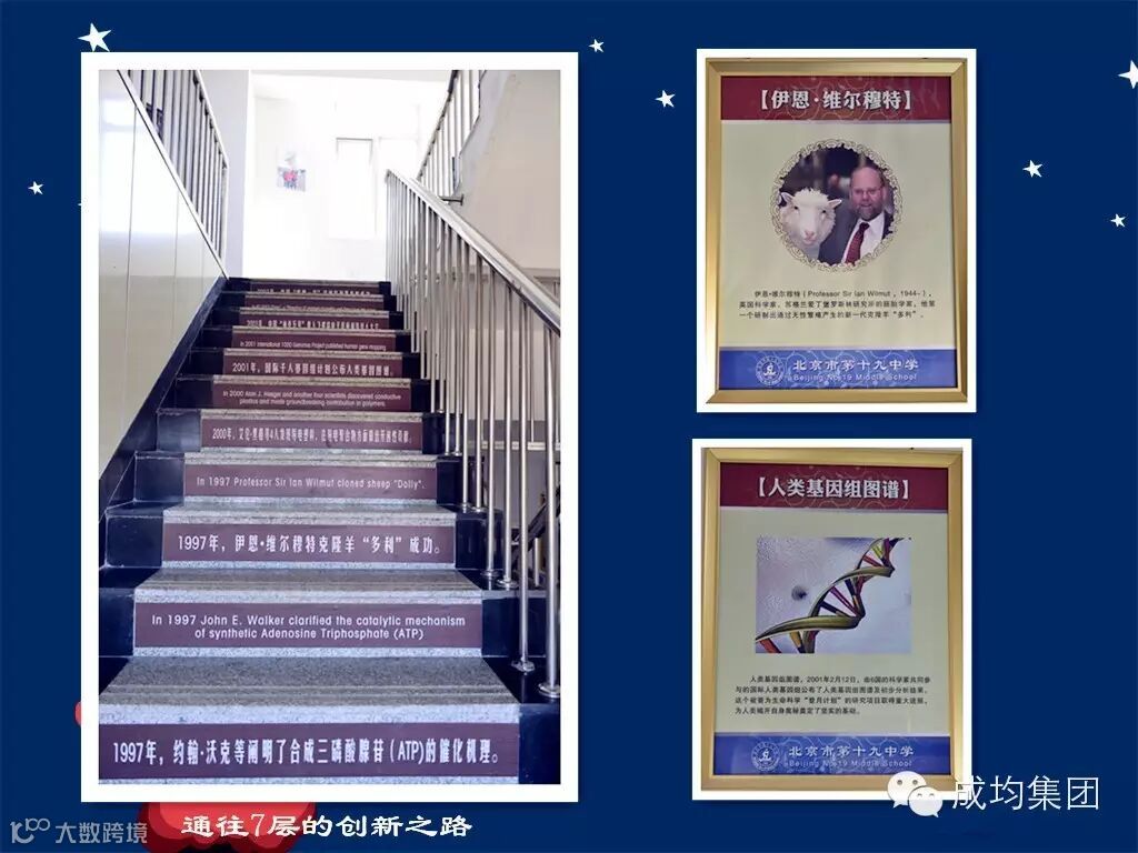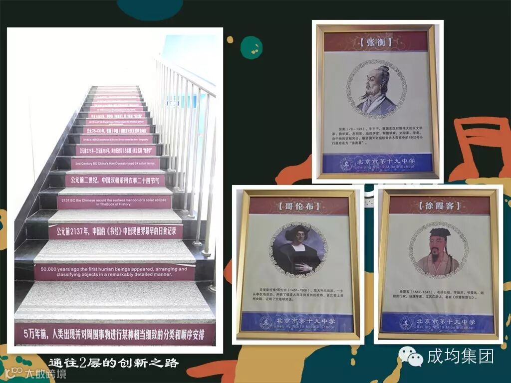 从楼梯拾级而上,每一个阶梯都用中、英文写着科技发展历程中的重大事件。这些事件是从生物、化学、物理、地理这几个学科里面按照时间排列精心挑选出来的。一路走上去,正是人类不断创新、成长的过程。