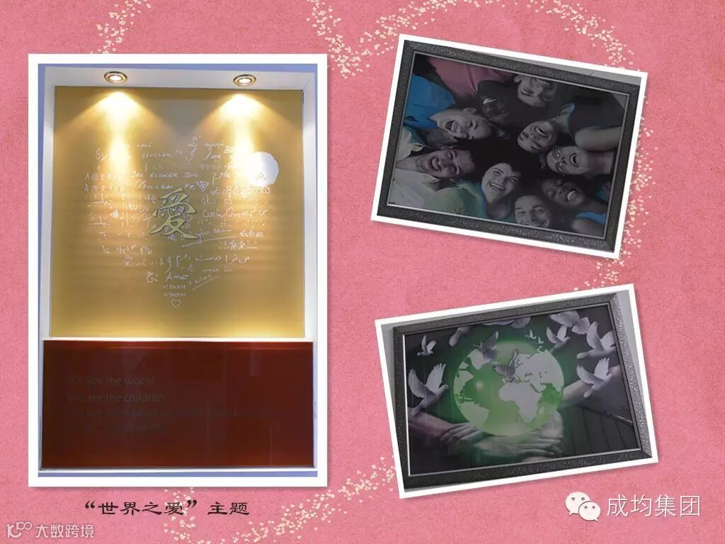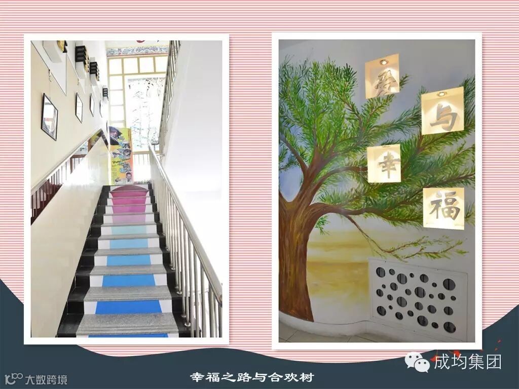 幸福之路的每层楼道都对“大爱”进行“爱与幸福”的主题诠释,一层到二层为父母之爱,二层到三层为师生之爱,三层到四层为祖国之爱,四层到五层为世界之爱。