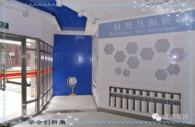 进入科技中心大门,迎面可见科技创新角。创新角以白色和蓝色的设计突出“科技创新”主题,体现学校育人目标“六会”中的“学会创新”。设计中融合了古今中外科技元素,墙面下方装饰的算盘与另一侧的计算机键盘相呼应,凸显蜂巢相伴,星光闪耀!