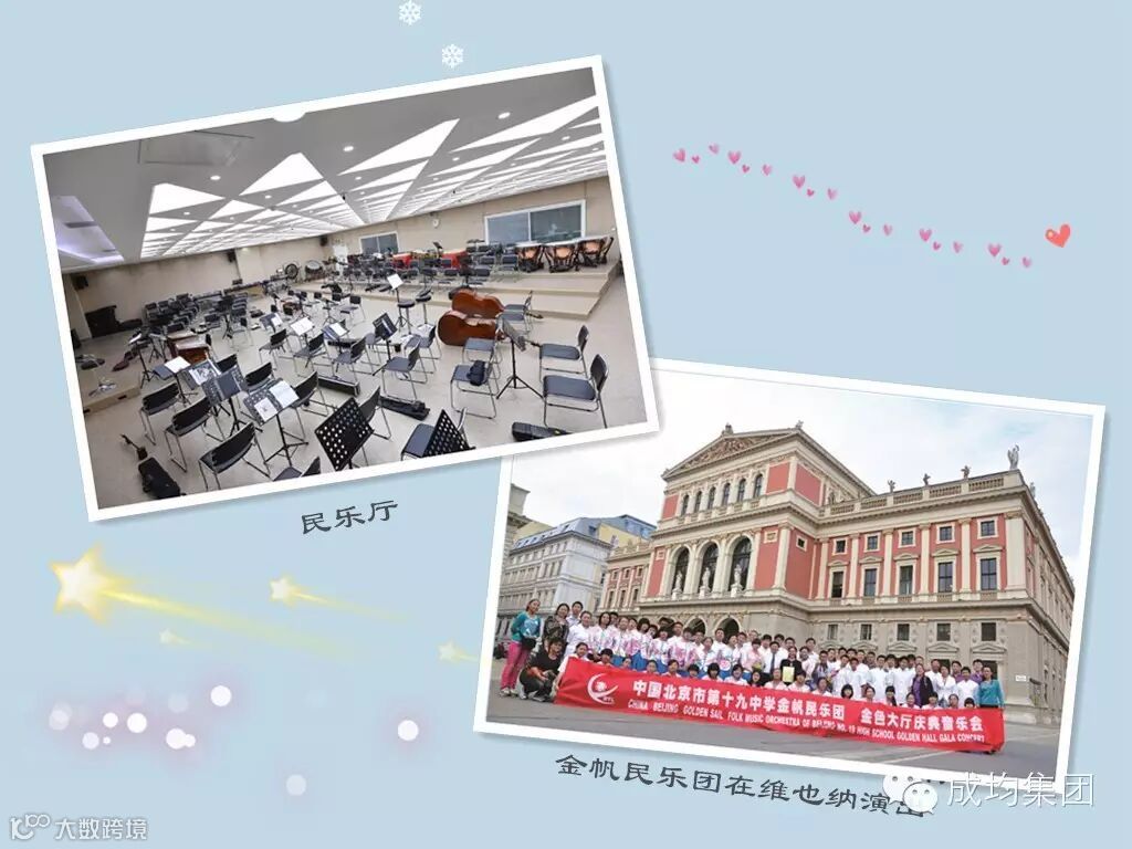 音乐中心改造开辟出三条宽敞的走廊。这三条走廊被命名为风雅颂,分别是风之韵、雅之韵和颂之韵。在每条走廊两侧的墙壁上,都悬挂着学生在世界各地演出的照片。