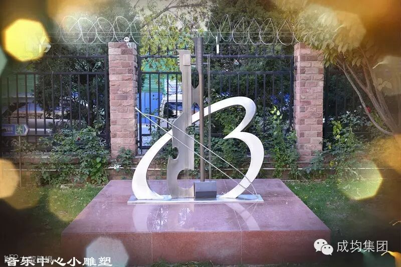 在音乐教育中心门前草坪处,有一座雕塑作品,这件巧妙设计作品将中西方代表性乐器“二胡与提琴”融合在一起,可谓开宗名义,表明音乐教育中心中西合璧的特色。