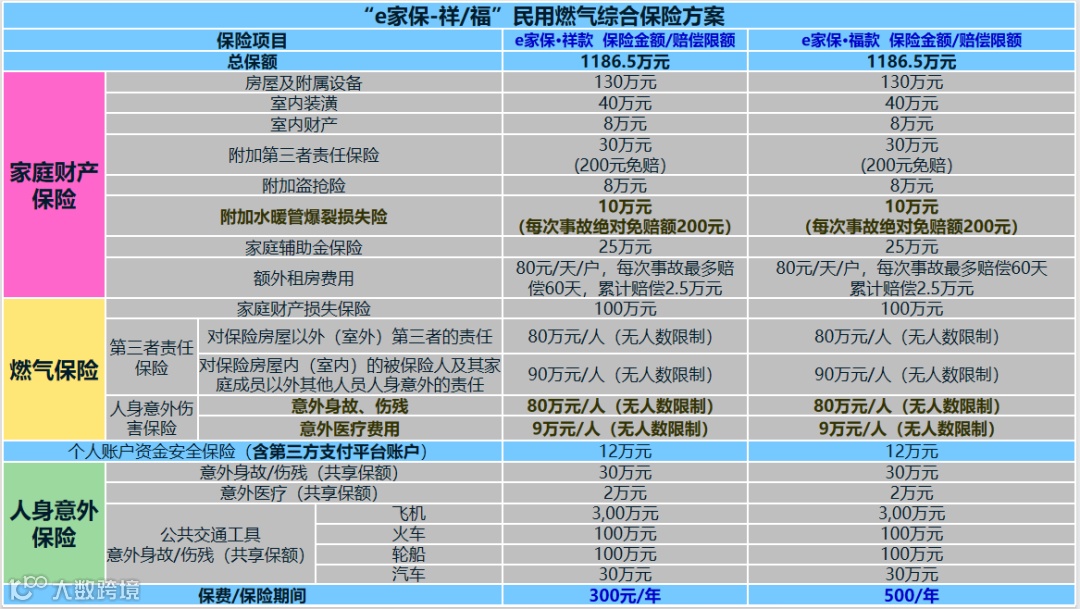 e家保综合险覆盖广、保障全、价格低。不仅保燃气原因引起的火灾爆炸等造成的家庭财产损失和人员伤亡(例如忘记关火,胶管脱落等意外);还保由于自然灾害造成的财产损失(比如台风、暴雨、冰雹造成窗户受损,打雷造成的电视机等电器的损失);人身意外险还保全家最多6口人的意外医疗保障(比如骑电瓶车摔伤,外出磕碰伤等,保障投保人及家属不受地域限制造成的意外及乘坐飞机高铁等公共交通的意外)