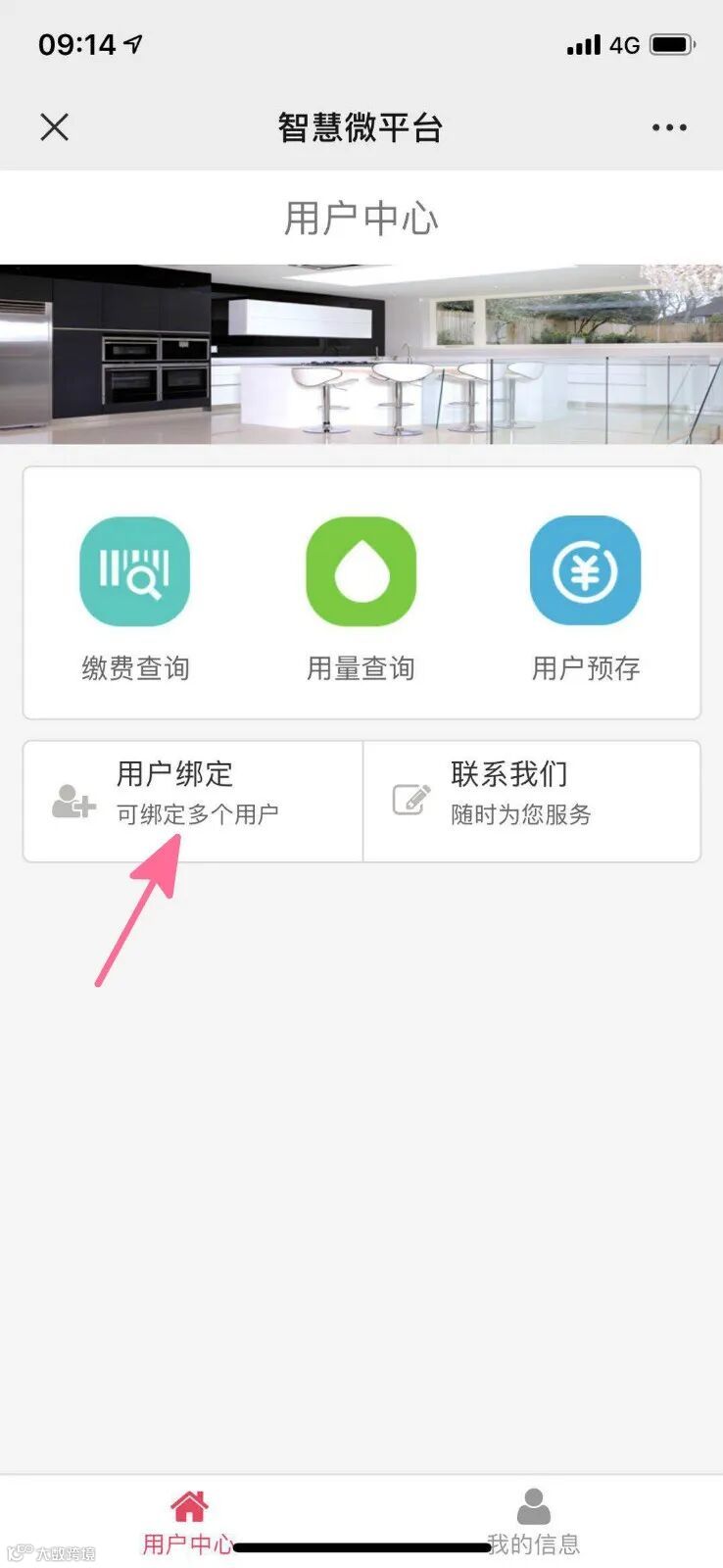这是一个主界面,可以查询用气量、缴费记录、剩余金额。首先我们需要绑定物联网表,点击“用户绑定”