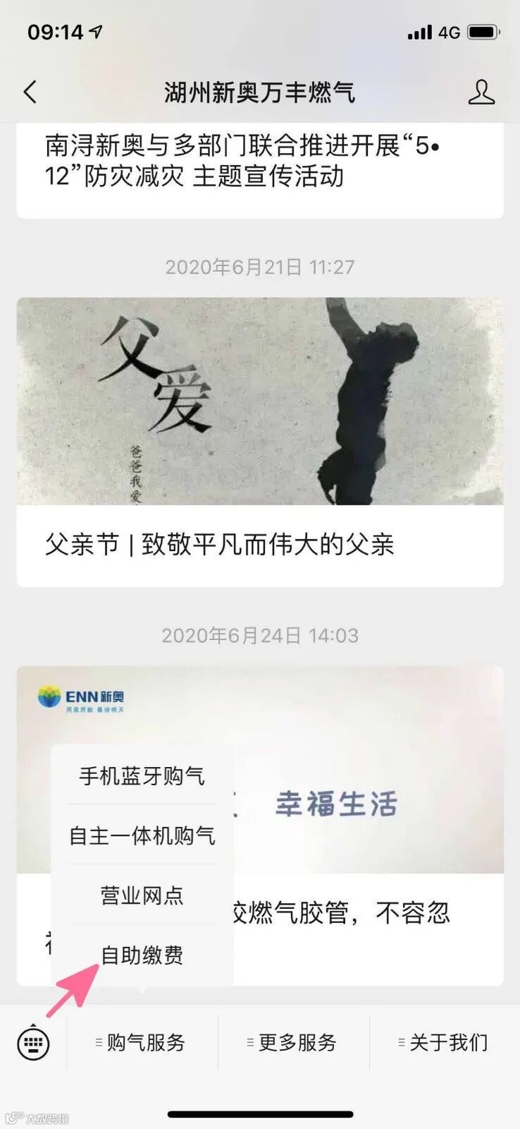 打开微信公众号,点击“自助缴费”