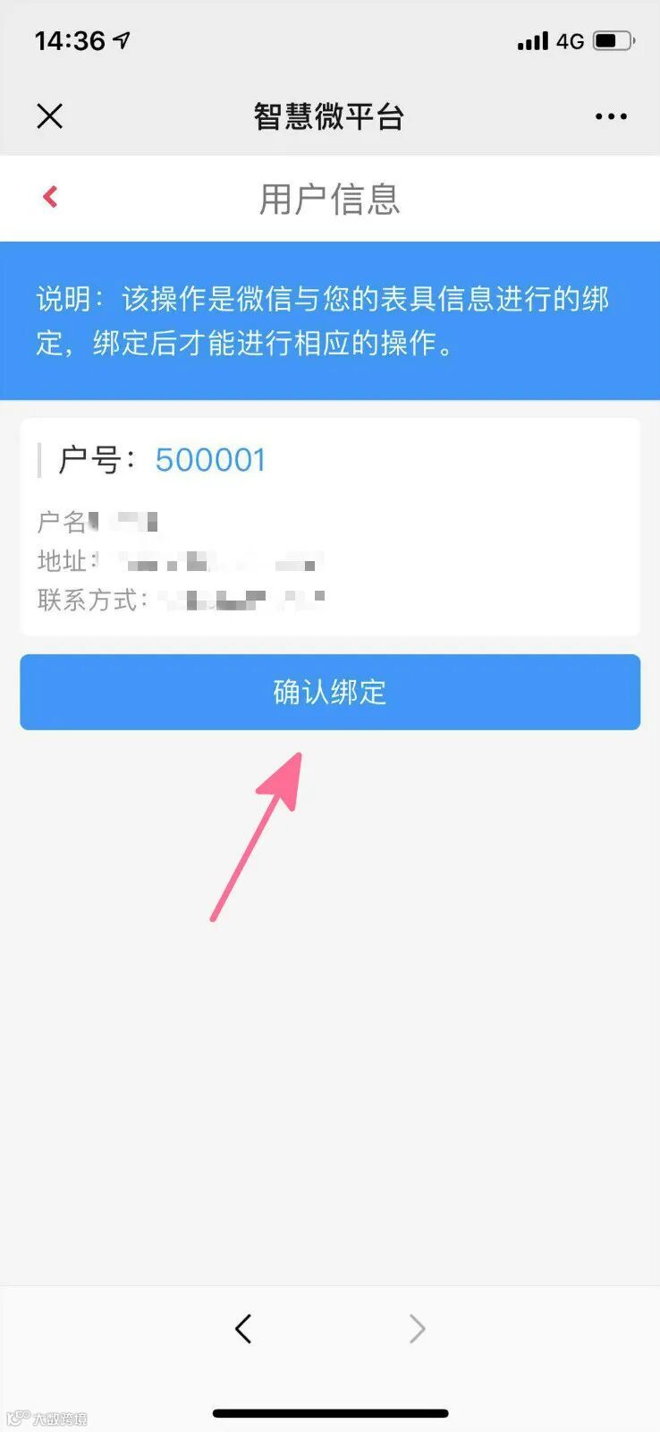 输入户号(安装物联网表时,安装师傅会提供户号,咨询请拨打3077686)