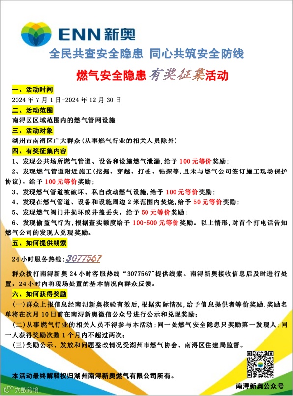 为落实湖州市及南浔区主管部门要求,发动社会力量参与燃气安全管理,建立社会联防机制,充分调动群众报告燃气安全隐患的积极性,营造燃气安全全民参与,共同守护的良好氛围,公司计划开展南浔新奥全民燃气安全隐患有奖征集活动,现将活动有关情况公告如下: