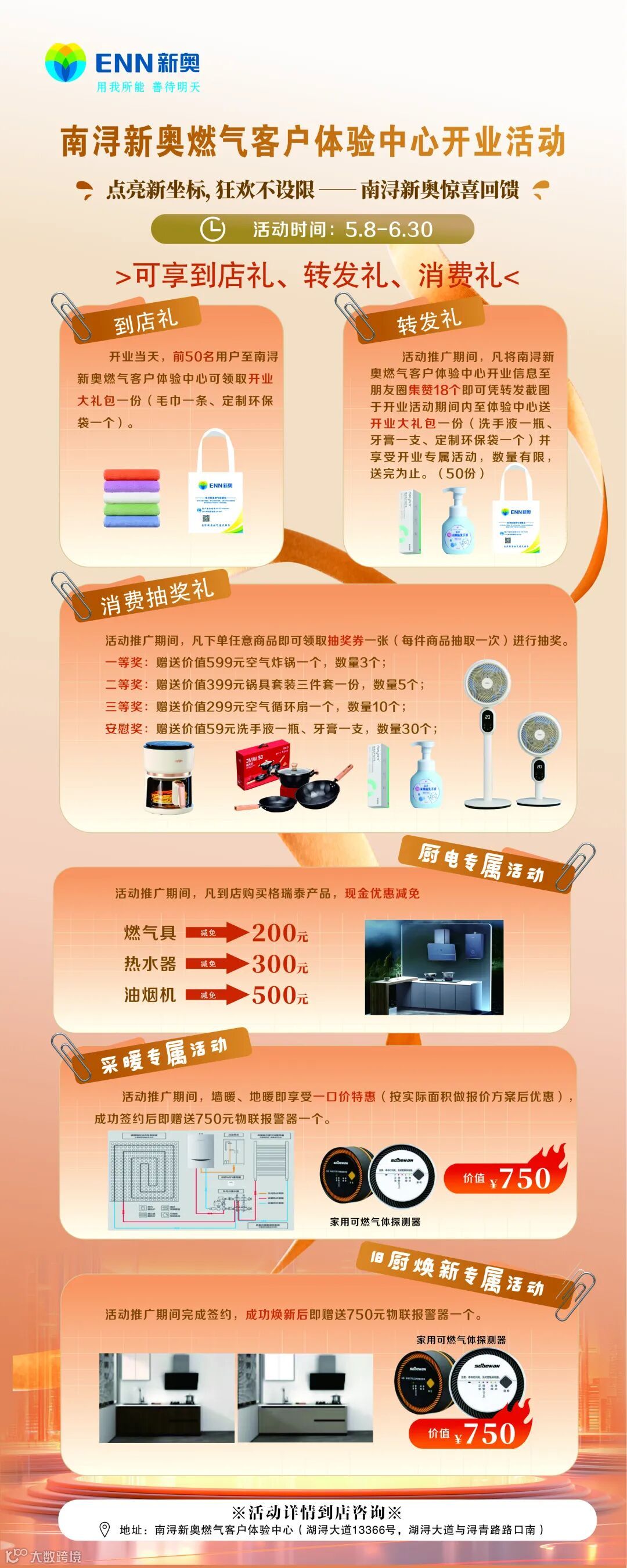 导读:湖州南浔新奥燃气客户体验中心2025年5月8日盛大开业开业当天有抽奖、到店礼、转发礼等各项活动,惊喜不断!