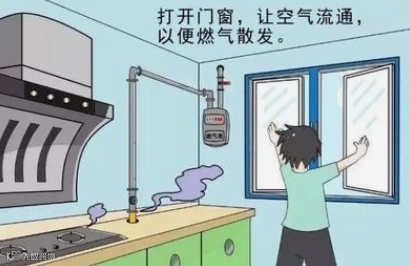 确认漏气后,立即将厨房窗户打开进行充分通风(天然气爆炸浓度在体积分数5%-15%之间,通风可以有效防止燃气闪爆),并注意关上与客厅连通的移门,防止燃气逸散到其他房间。