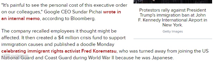 谷歌CEO说,看到这个局面对我们同事的影响是非常痛心的!公司召回了他们认为可能受到影响的员工,然后创建了一个400万美元的危机基金来支持移民的问题。