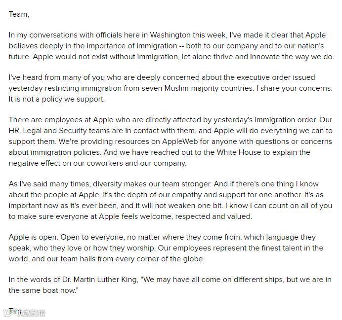 换个场景来看看苹果这边,Tim哥可是直接满满诚意写了封信发给员工们安抚人心啊,表示没有移民就没有苹果,小英一连读了几遍也是十分感动。