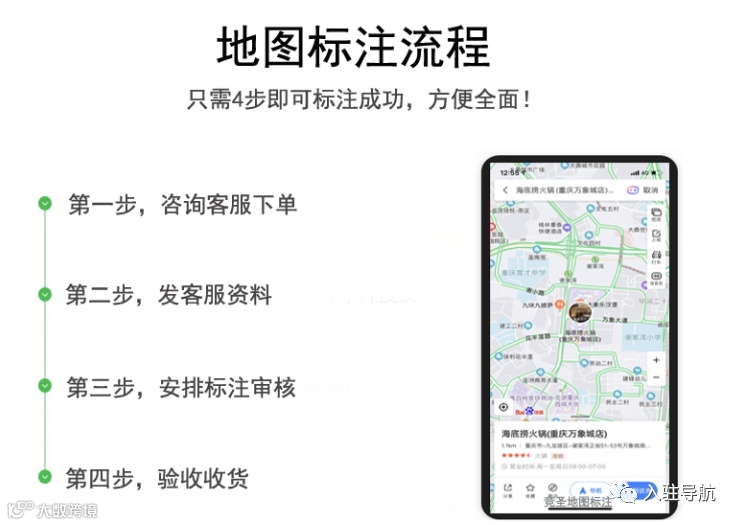 顾客可以在百度搜索和百度地图搜到您的地点 精确导航,帮助顾客准确导航到店不偏离面向的合作伙伴。根据以往经验,客户对标注满意后通常会持续进行地图深度标注,以及进行口碑宣传等积极方式进行传播,对提高指路人地图标注的市场占有率和品牌的美誉度起到强而有力的作用。(需要请加微信客服或者电话咨询:15730087443)若顾客因服务不满意,据实证研究结果表明:96%的消费者遇到服务不周到的情况是不会投诉的,但90%的不满意消费者是不会再购买众图互通的产品和服务,或将他们的经历告诉至少另 外9个人,13%有过不满意经历的消费者会将他们的经历告诉20个人以上。我们只是代客户提交商户、企业位置资料,不是地图标注平台方,所提供服务为商业有偿帮助咨询服务,全程都是人工提交资料,自身并不能对第三方网站的原始内容进行编辑,请知悉。需要请加微信客服或者电话咨询:15730087443。
