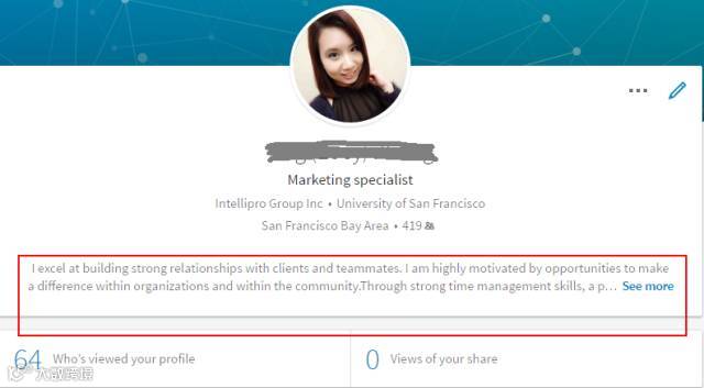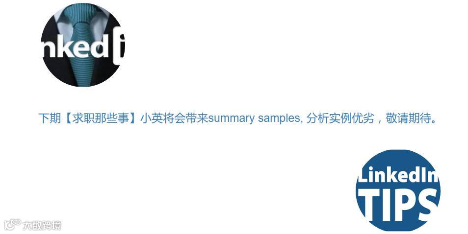 LinkedIn Summary位于LinkedIn主页除名字和头衔以外最明显的位置,在领英中文版又名职业概要。