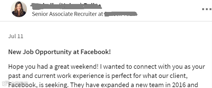 看着身边一个个同学收到了录取通知,A君并没有放弃。A君积极在LinkedIn上与校友互动交流、邀请老师写推荐,跑career center预约模拟面试,改简历改到成了圈内范本...在焦虑和忐忑中,每个职位每个location都去申请。几经曲折,A君在毕业后靠朋友推荐进了一家CPA公司的工作,工资名气都不比四大。但此时,却意外收到了LinkedIn上的recruiter发来的facebook职位的邀请!