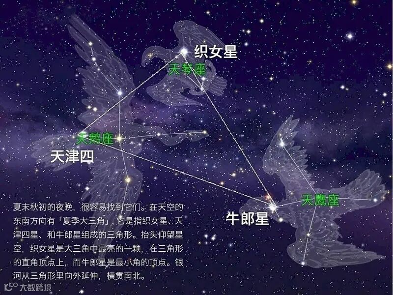 “牛郎和织女”的故事在星座上也能反映出来。七夕之夜,如果天气晴朗,能看见灿烂星河,那么将天空中最亮的三颗星连起来,就是大家常说的“夏季大三角”,“夏季大三角”是由三个不同星座的阿尔法星组成。