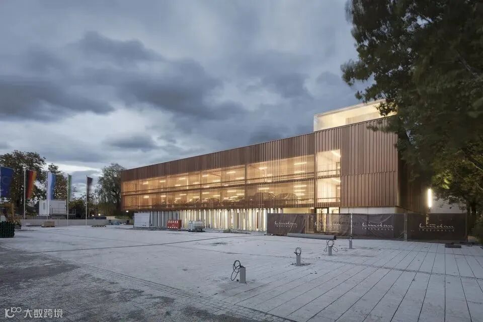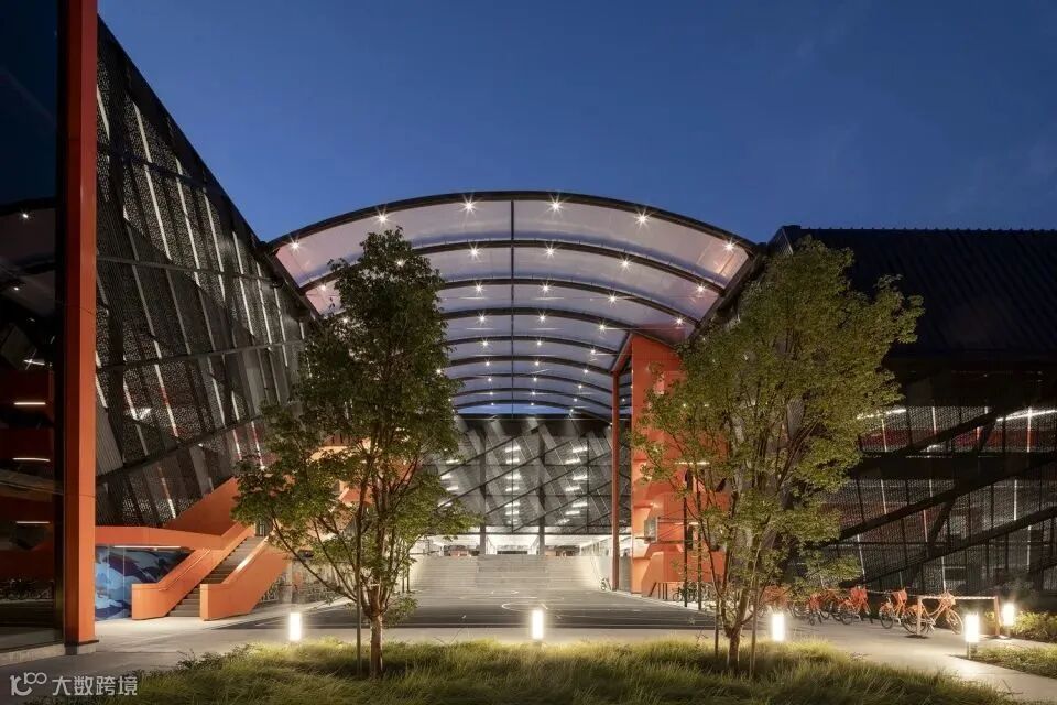 建筑如同庞然大物般植入场地之中。带有不规则波浪纹理的立面穿孔金属板,为建筑内部营造了悦动又丰富的光影空间。暖调的金属外壳在日光下闪闪发光,它隐匿在城市之中,却又优雅的向人们宣誓它的存在。