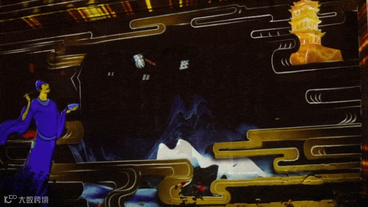 不同于传统夜游或演艺的模式,《夜上黄鹤楼》采用「光影+演艺」的方式,打造出辛氏沽酒、崔李题诗、岳飞点兵、仙子起舞以及黄鹤楼变迁等沉浸式故事场景。在主楼前设12块移动屏,使用程控纱屏车技术,根据楼宇设计移动。通过科技助力,让千年名楼黄鹤楼“活起来”。