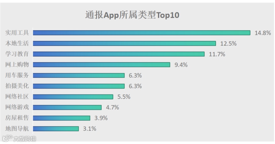 根据2026年02月国家监管机构的最新通报数据,“实用工具类”App以占据总通报数的14.8%位居第一,“本地生活类”App以总通报数的12.5%紧随其后。App通报应用类型Top10的分布概览图如下所示: