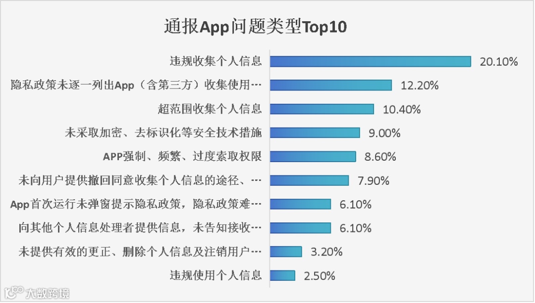 根据2026年02月国家监管通报的数据,违规收集个人信息问题最多,隐私政策未逐一列出 App(含第三方)收集使用个人信息的目的、方式、范围等问题其次。App通报问题类型Top10的分布概览图如下所示:
