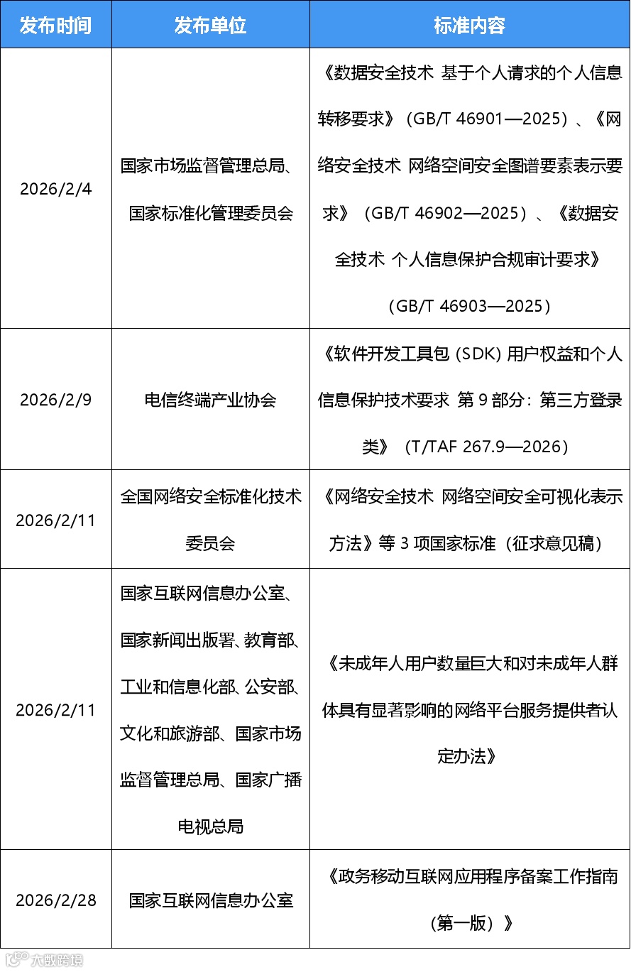 本期,我们全面梳理并分析2026年02月期间App隐私合规领域的新政策、新法规、新动态以及违规通报资讯信息,助力企业明确合规要求,掌握监管重点推动企业移动应用合规安全建设,同时为相关从业者提供有价值的参考和指导。