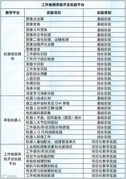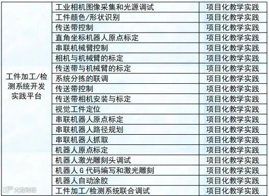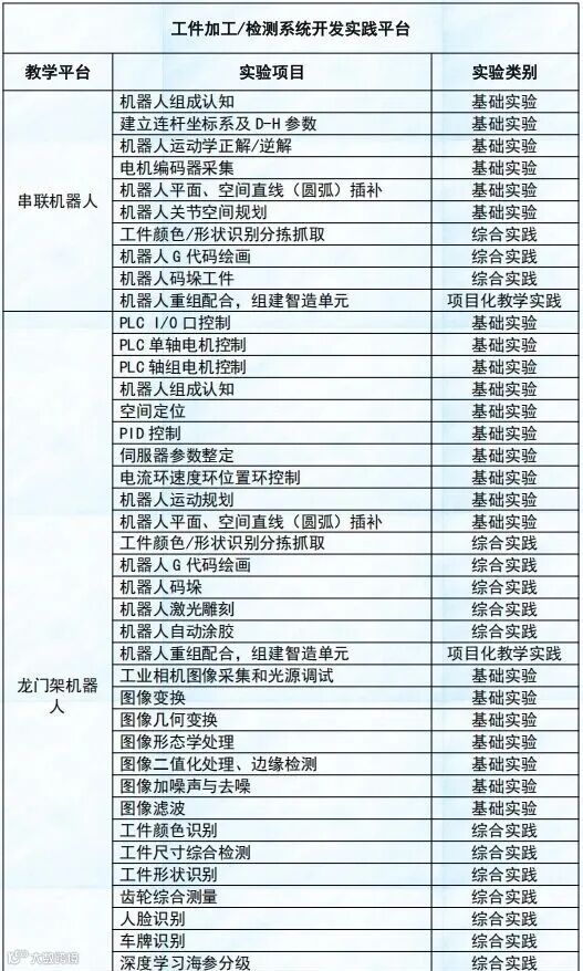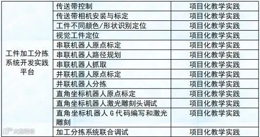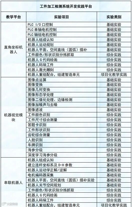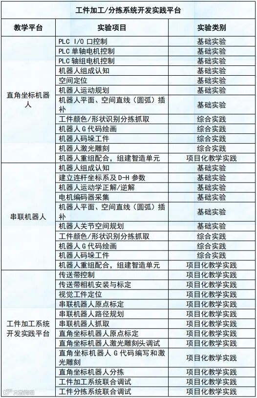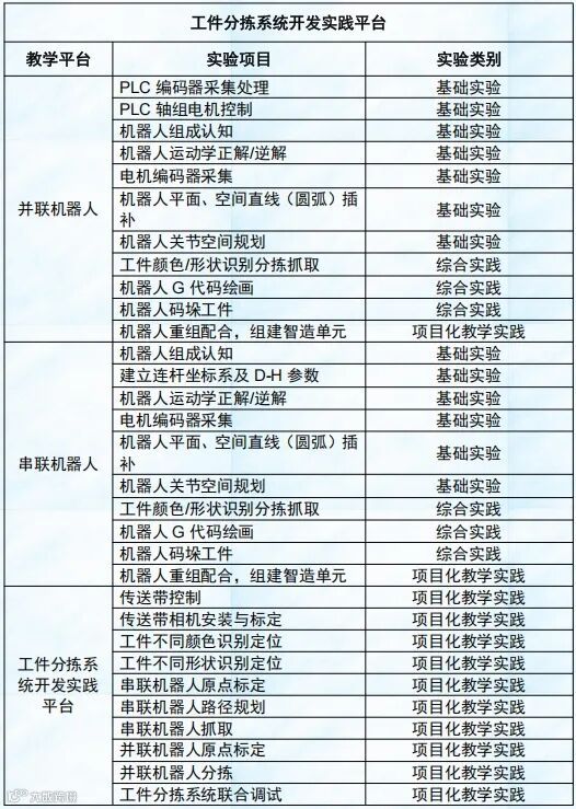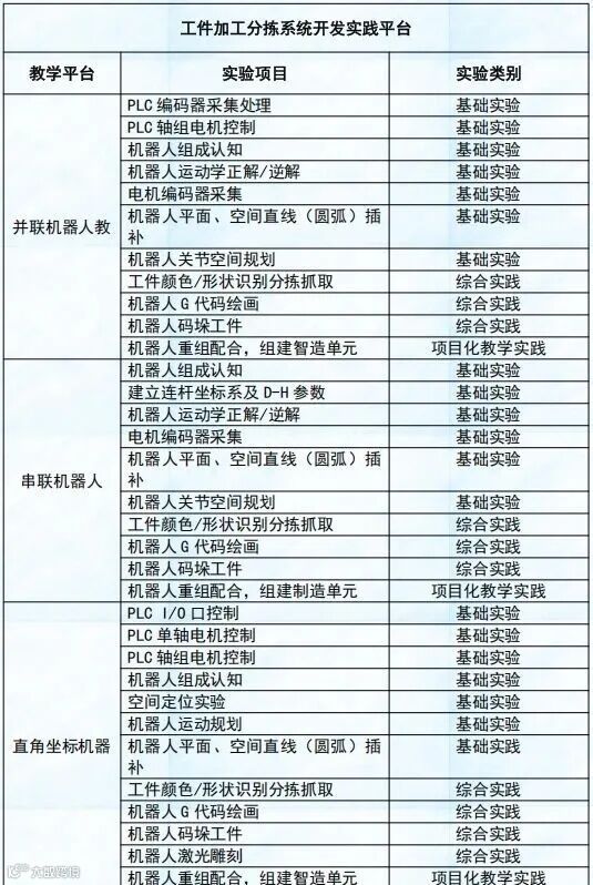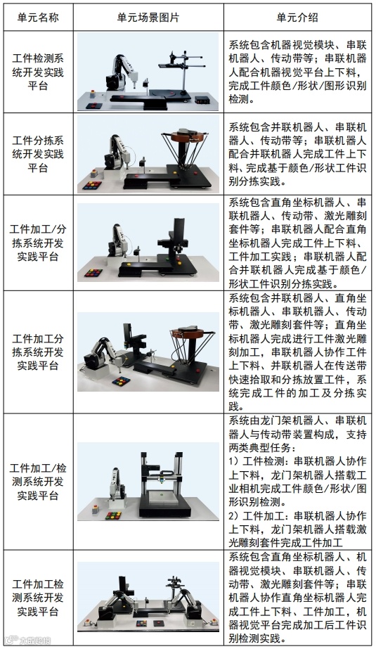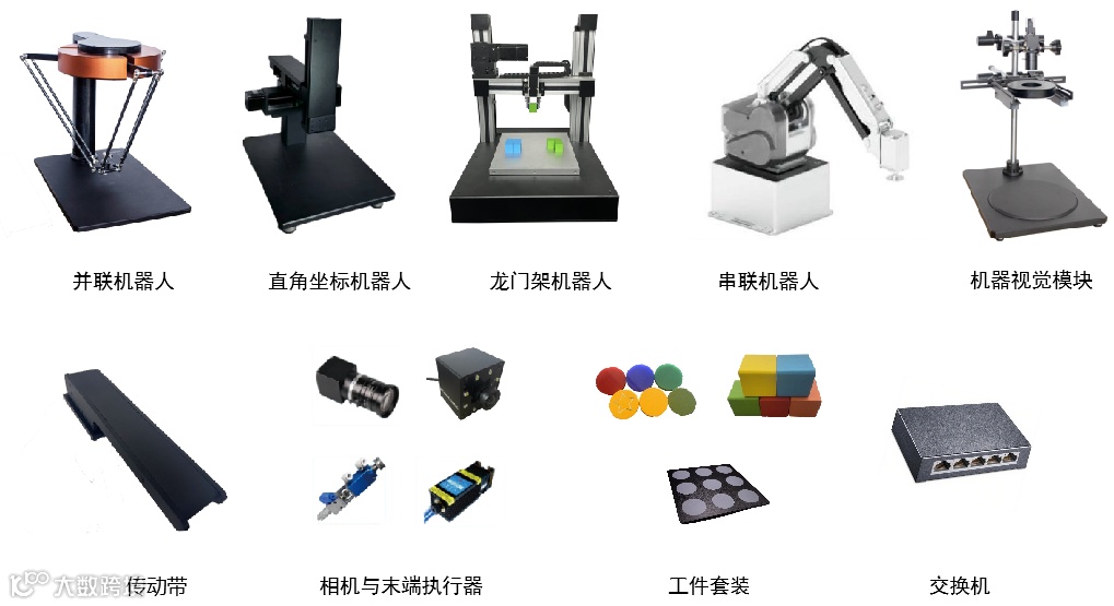 多场景机器人智造单元项目化实践教学平台,是以成果导向教育(OBE)教学理念为依托,以项目化实践教学模式(PBL)为实施方法构建的实践教学平台系统。包括直角坐标机器人模块、并联机器人模块、龙门架机器人模块、串联协作机器人模块、机器视觉模块、相机与执行器模块、传动带装置、交换机、工件套装等。各机器人模块可独立使用,可以重组使用。构建不同类型的机器人加工、分拣、检测等系列智造单元系统。实践教学过程体现理实一体、模块化、可重组、多场景、数智化、项目化教学要求,有效支撑院校机器人工程、智能制造、机电、自动化等相关专业的课内实践教学。