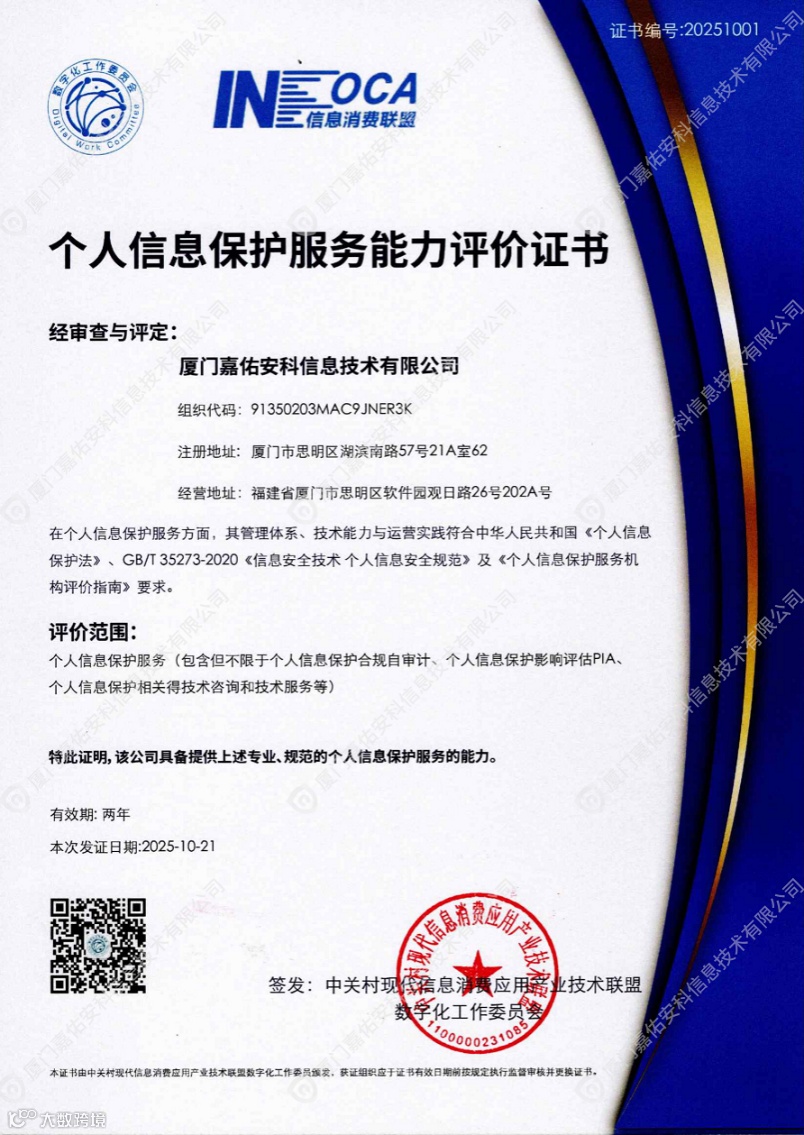 厦门嘉佑安科信息技术有限公司深耕个人信息保护领域,以 “成为人民隐私安全的忠诚守护者”为愿景,以“保护人民合法权益、守护个人信息安全”为使命,为政府、企业、监管部门提供全场景个人信息保护解决方案。 |