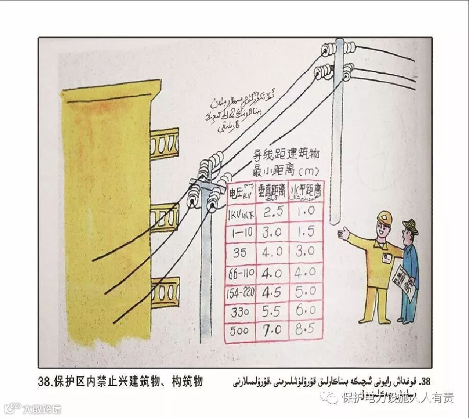 (一)架空电力线路保护区:导线边线向外侧水平延伸并垂直于地面所形成的两平行面内的区域,在一般地区各级电压导线的边线延伸距离如下: